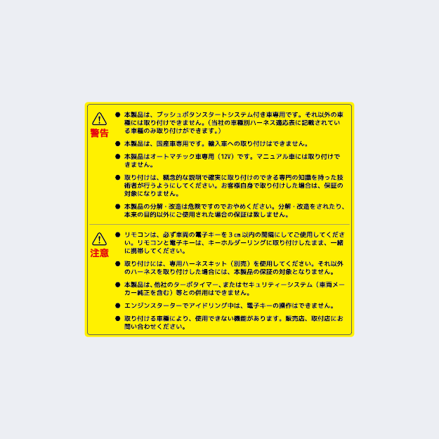 - エンジンスターターをお取付の際は、エンジンスターター本体と取付専用ハーネス、車種によりオプションが必要となります。専用ハーネスやオプション品は、専用のページより別途ご購入ください。