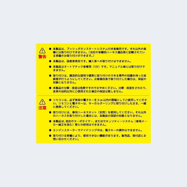 - エンジンスターターをお取付の際は、エンジンスターター本体と取付専用ハーネス、車種によりオプションが必要となります。専用ハーネスやオプション品は、専用のページより別途ご購入ください。