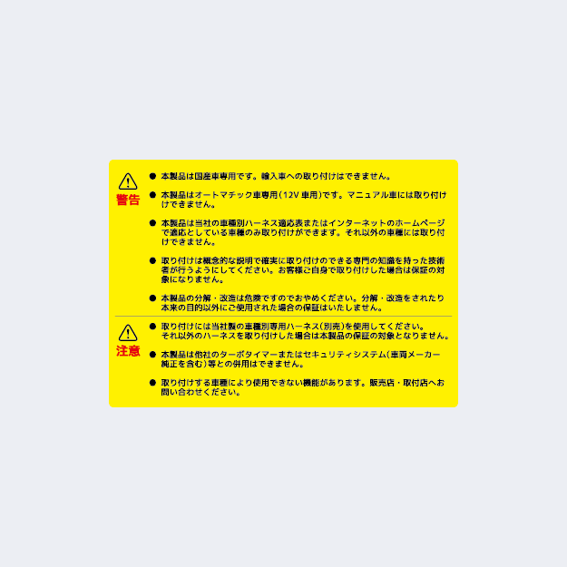 - お取付店様に関しましては弊社よりご紹介はできません。お客様ご自身で事前にお取付店様をお探ししてからご購入ください。お取付は車種別取付資料を参考に専門の知識を持った技術者が行うようにしてください。